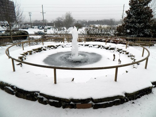 Water is frozen and snow covers the ground at the garden at Jackson Square in Oak Ridge on Tuesday evening.