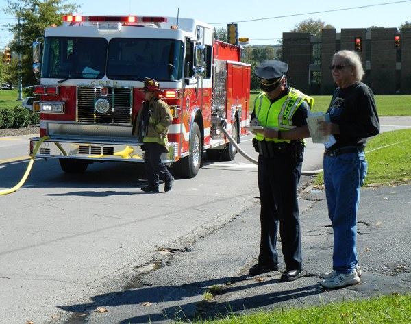 Above, Oak Ridge resident Glenn Bell, who now owns the car, talks to Oak Ridge Police Department Lieutenant John Kelly after Bell’s 1965 Studebaker station wagon caught fire Friday.