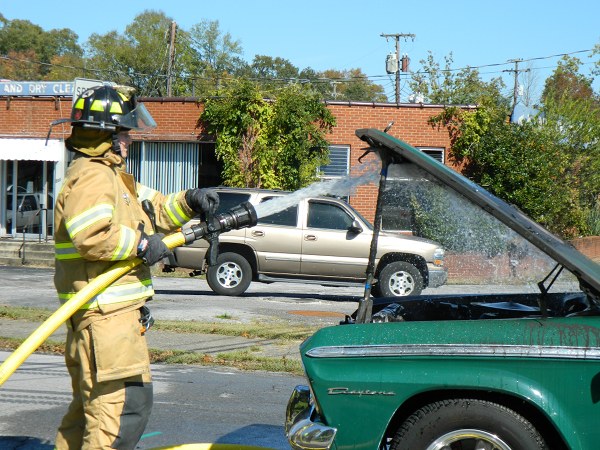 A 1965 Studebaker station wagon once owned by Dan Truhitte, who played the German officer Rolfe in “The Sound of Music” in 1965, caught fire in Oak Ridge on Friday. Above Oak Ridge Fire Department firefighter Steven London, left, sprays water on the bottom side of the four-door wagon. At right is ORFD firefighter Sandra Sila-Massengill.