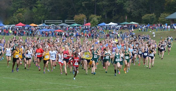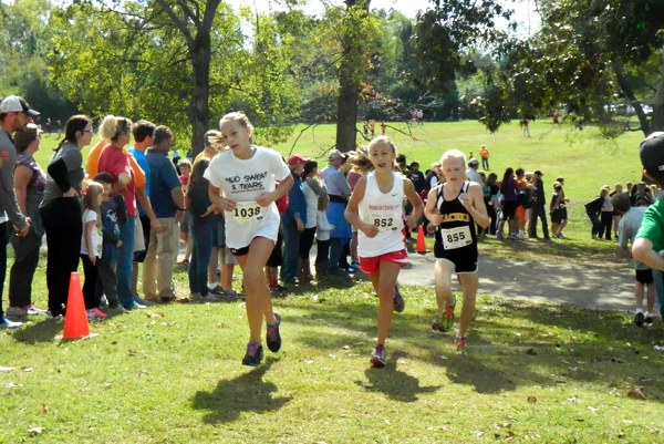 The start of the varsity girls race during the 2014 Tennessee Middle School Cross Country Championships at Victor Ashe Park in Knoxville on Saturday. Fellers (852) is visible near the front. (Photo by Shellie Fellers)