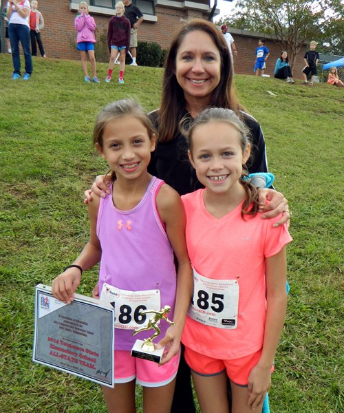 Faith McGhee, left, a fourth-grade student at Woodland Elementary School, placed eighth in a state cross country meet at Victor Ashe Park in Knoxville on Saturday. It was the first year that McGhee and Darbey Marczak, right, also a fourth-grader at Woodland, ran cross country, and both made state. At center is their coach, Farah McGhee, who is Faith’s mother. (Photo by John Huotari)