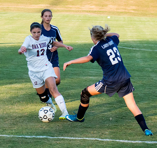 Senior midfielder Alex Allen (12) had her first hat trick for the Lady Wildcats on Tuesday, Sept. 8, 2015, scoring three goals for Oak Ridge in a 6-1 win over Grace Christian at home. Pictured behind Allen is senior Ellie Brown (8), who also scored Tuesday. In background is junior Allie Dunn (1), who scored the one goal for Grace Christian. (Photo by John Huotari/Oak Ridge Today)