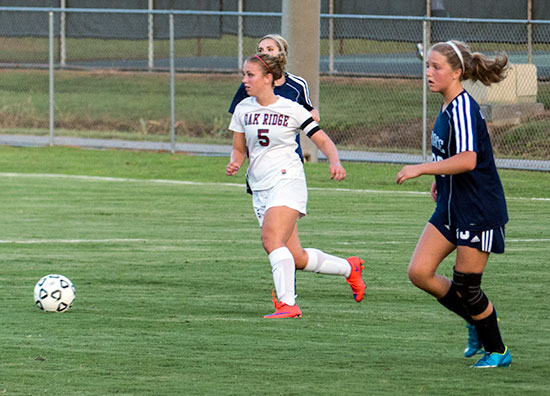 Senior defender Katie Welsh (5) scored on a header in the second half against Grace Christian on Tuesday, Sept. 8, 2015, giving Oak Ridge a 5-1 lead. Welsh is pictured above in the first half. (Photo by John Huotari/Oak Ridge Today)