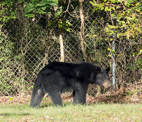 After local and state officers flushed it at about 7 p.m., this black bear climbed a chain link fence on the east side of Anderson County High School and was last seen headed north on Tuesday, Oct. 6, 2015. (Photo by John Huotari/Oak Ridge Today)