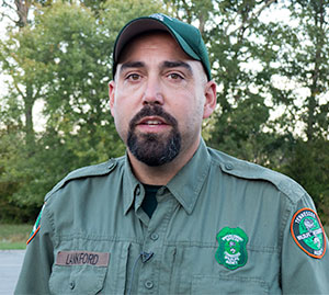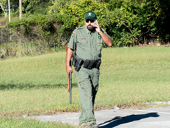 TWRA Wildlife Officer Jason Lankford sets up a perimeter on the northeast corner of Anderson County High School after a black bear was reported there at about 3:55 p.m. Tuesday, Oct. 6, 2015. (Photo by John Huotari/Oak Ridge Today)