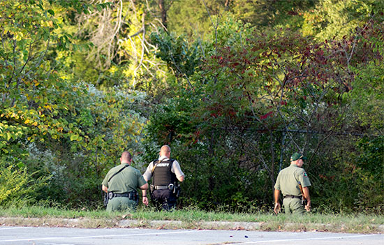 Armed with shotguns, rifles, and rubber bullets, Anderson County Sheriff’s Department deputies and Tennessee Wildlife Resources Agency officers chase a black bear from Anderson County High School on Tuesday, Oct. 6, 2015. (Photo by John Huotari/Oak Ridge Today)