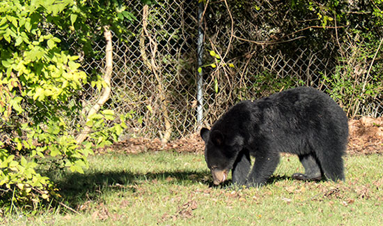 A black bear that was at Anderson County High School for about three hours on Tuesday, Oct. 6, 2015, spent much of its time digging and eating acorns under a white oak tree on the east side of campus. (Photo by John Huotari/Oak Ridge Today)