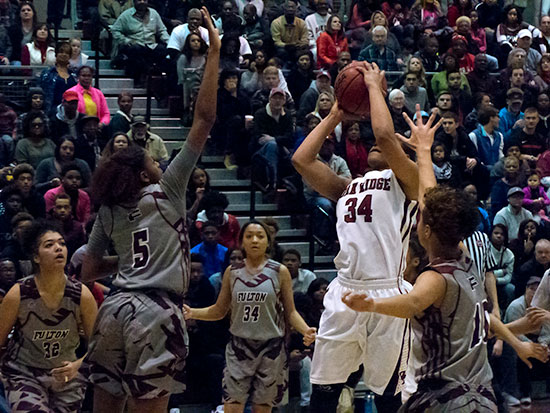 Fulton sophomore post Janae Fuqua (32) shoots over Oak Ridge sophomore post Mykia Dowdell (34) during a 30-26 win for the Lady Falcons at Wildcat Arena on Saturday, Feb. 13, 2016. (Photo by John Huotari/Oak Ridge Today)
