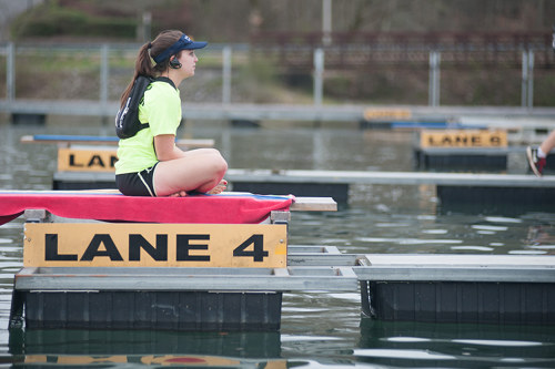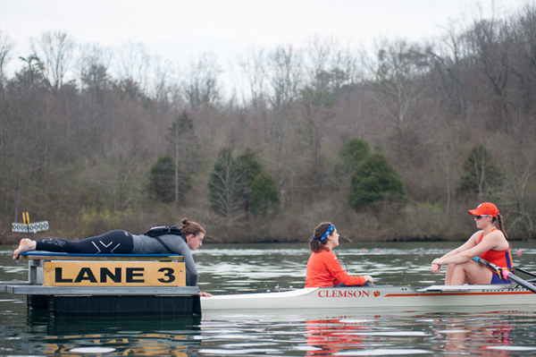 Twelve of the nation’s best NCAA Division I women’s rowing teams competed this weekend in the Cardinal Invitational Regatta in Oak Ridge. A Clemson University team lines up at a starting dock at Oak Ridge Marina on Saturday, March 12, 2016. (Photo by Julio Culiat)