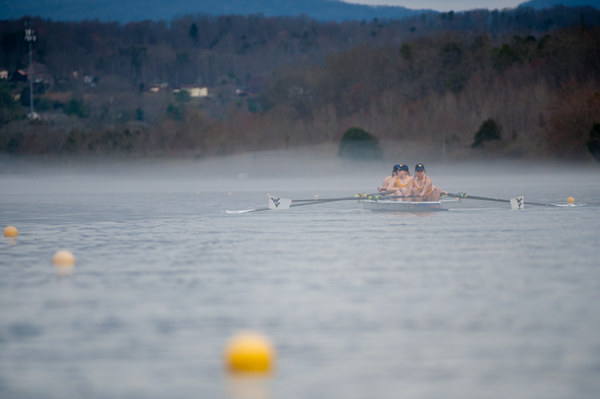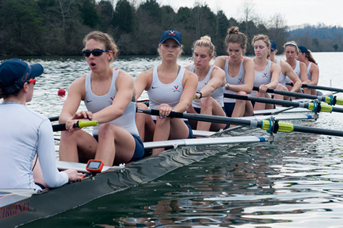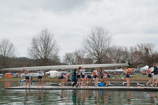 Twelve of the nation’s best NCAA Division I women’s rowing teams competed this weekend in the Cardinal Invitational Regatta in Oak Ridge. A University of Virginia team prepares to race at Oak Ridge Marina on Saturday, March 12, 2016. (Photo by Julio Culiat)