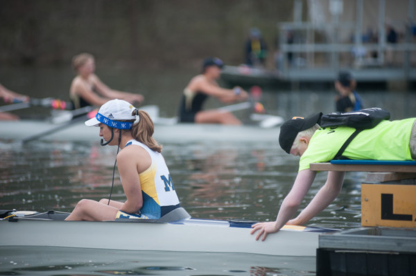 Twelve of the nation’s best NCAA Division I women’s rowing teams competed this weekend in the Cardinal Invitational Regatta in Oak Ridge. A University of Michigan team lines up at a starting dock at Oak Ridge Marina on Saturday, March 12, 2016. (Photo by Julio Culiat)