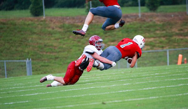 The Oak Ridge Wildcats play defense against the Heritage Mountaineers during a scrimmage at Blankenship Field on Friday, July 29, 2016. Pictured above making the tackle for Oak Ridge is Chase Kimbro (10). (Photo by Luther Simmons)