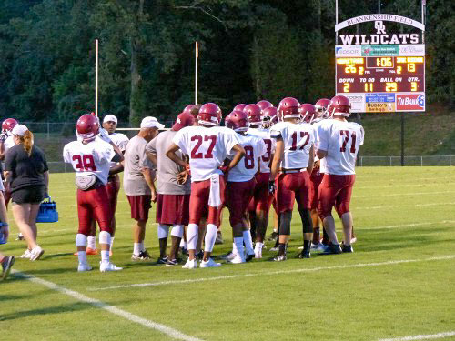 The Oak Ridge Wildcats huddle during a scrimmage against Heritage at Blankenship Field on Friday, July 29, 2016. (Photo by John Huotari/Oak Ridge Today)