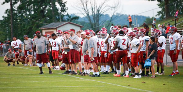 The Oak Ridge Wildcats and coaches are pictured above on the sideline during a scrimmage against Heritage at Blankenship Field on Friday, July 29, 2016. (Photo by Luther Simmons)