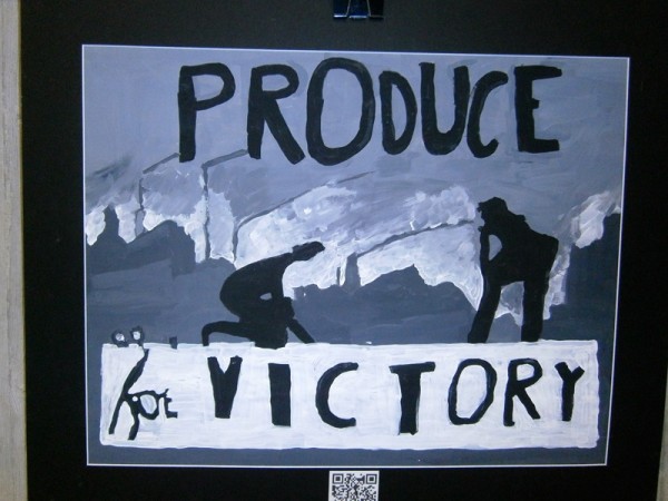 Several pictures are recreations of signs and billboards that were posted in Oak Ridge during the 1940s, encouraging security and labor for victory in World War II. Some of the pieces have QR codes that allow a viewer equipped with a QR code scanner app on a smart phone to view a video of the students describing their artwork.