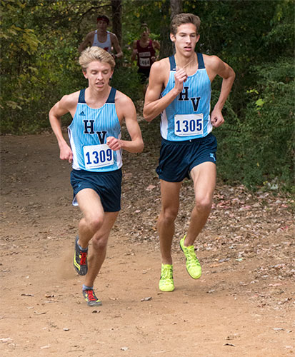 Kenton Bachmann of Hardin Valley Academy, right, finished sixth in the Region 2-AAA boys’ cross country race at Victor Ashe Park in Knoxville on Thursday, Oct. 27, 2016, and Brennan Humphreys, left, finished 14th. (Photo by John Huotari/Oak Ridge Today)