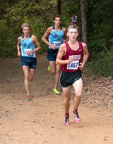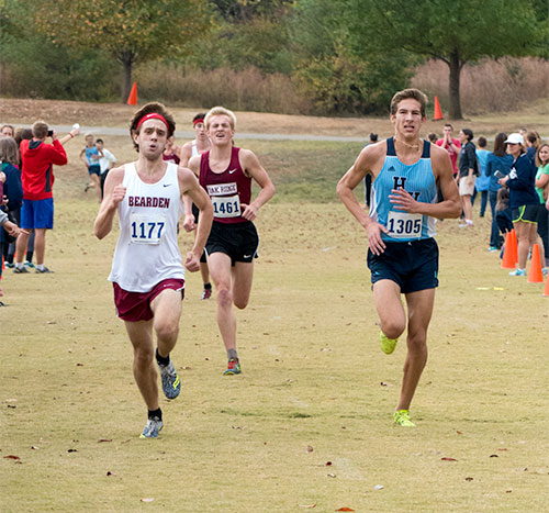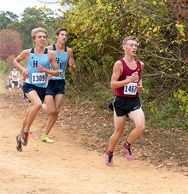 Daeton Byars of Oak Ridge set a personal record, finishing eighth in the Region 2-AAA boys’ cross country race at Victor Ashe Park in Knoxville on Thursday, Oct. 27, 2016. At right is Kenton Bachmann of Hardin Valley Academy, who finished sixth, and at left is Nathaniel Blalock of Bearden, who finished seventh. (Photo by John Huotari/Oak Ridge Today)