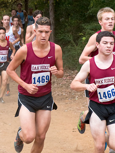 Reid Dukes of Oak Ridge, right, who also competes in track, finished 10th in the Region 2-AAA boys’ cross country race at Victor Ashe Park in Knoxville on Thursday, Oct. 27, 2016. Daeton Byars of Oak Ridge, third from right, finished eighth. (Photo by John Huotari/Oak Ridge Today)