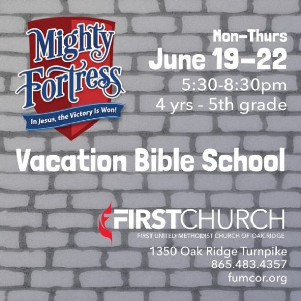 First United Methodist Church of Oak Ridge will be hosting Vacation Bible School “Mighty Fortress” from June 19-22 (Monday-Thursday) from 5:30 to 8:30 p.m.