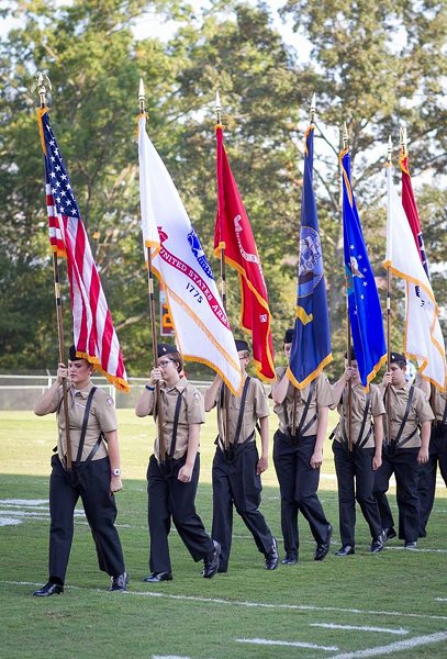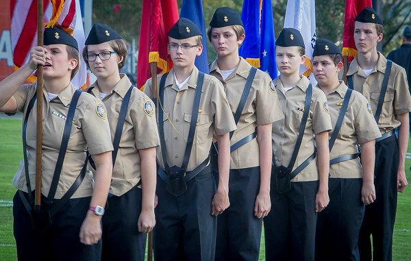 The Oak Ridge High School Navy Junior ROTC (Reserve Officers’ Training Corps) Color Guard is pictured above on Blankenship Field at the Oak Ridge-West football game on Friday, September 15, 2017. (Photo by Linda Ripley)
