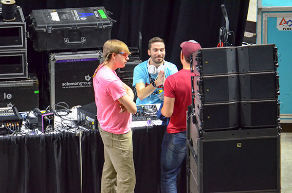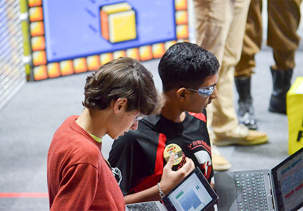 After a regional alliance win at the University of Tennessee in Knoxville on Saturday, March 24, 2018, the Secret City Wildbots robotics team of Oak Ridge, Team 4265, is headed to the World Finals in Houston in April. Pictured above are former team members Luke Buckner, left, who now serves as a graduate adviser to the team, and Matthew Martin, center, who is now a DJ for the event. (Photo by Angi Agle)