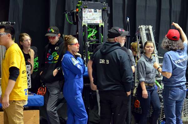 Among those pictured above are Mack Patrick, Patience Sims, and Mark Buckner waiting to take the field during the Smoky Mountains Regionals robotics tournament in March 2019. (Photo by Angi Agle)