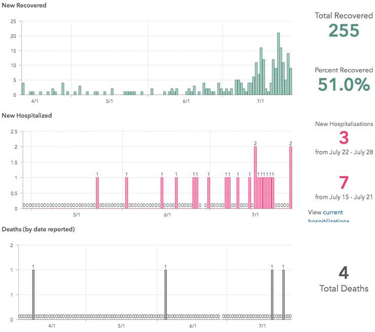 - Total hospitalizations (the state doesn’t report current hospitalizations by county)—24 (There was one more hospitalization reported Wednesday.)