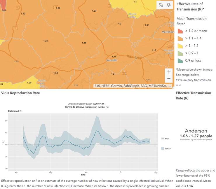 The transmission rate remained at about 1.16 on Tuesday, according to data published by Coronavirus-19 Outbreak Response Experts (CORE-19) at the University of Tennessee in Knoxville. If the rate is greater than one, the number of infections will increase.