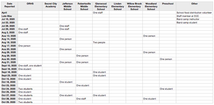 About 44 percent of the student cases, 14 of them, have been among ORHS students. Seven have been among Jefferson Middle School students, and five have been among Glenwood Elementary School students. There have been three among RMS students, two at Woodland, and one at the Preschool. No cases have been reported at Linden Elementary School, Willow Brook Elementary School, or Secret City Academy.