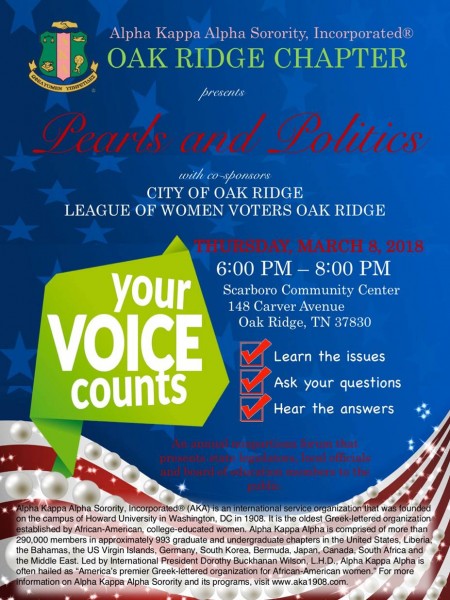 Filed Under: Community, Education, Front Page News, Government, Top Stories Tagged With: Alpha Kappa Alpha Sorority Incorporated Oak Ridge Chapter, City of Oak Ridge, League of Women Voters of Oak Ridge, nonpartisan forum, Pearls and Politics forum, Scarboro Community Center