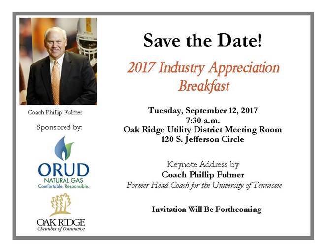 The invitation-only breakfast is sponsored by the Oak Ridge Utility District and the Oak Ridge Chamber of Commerce. It will be at ORUD on Tuesday morning, September 12.