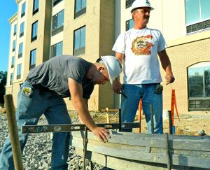 Concrete finisher Dennis Coffey, left, and skilled laborer Anthony Morgan set frames for curbs and gutters at Holiday Inn Express on Wednesday.