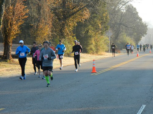 Half marathon competitors race down Emory Valley Road after starting on Briarcliff Avenue and then running down Laboratory Road, Oak Ridge Turnpike, and Melton Lake Greenway.