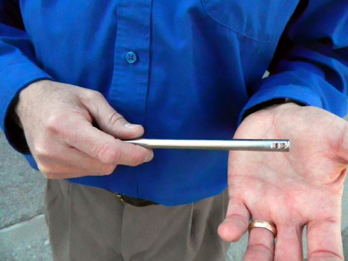 Bill Partridge, ORNL’s principal investigator, holds the laser diode-based probe that the lab developed to sample carbon dioxide in the engine’s intake system to help ensure recirculated exhaust gases are mixed uniformly. (Photo by John Huotari)