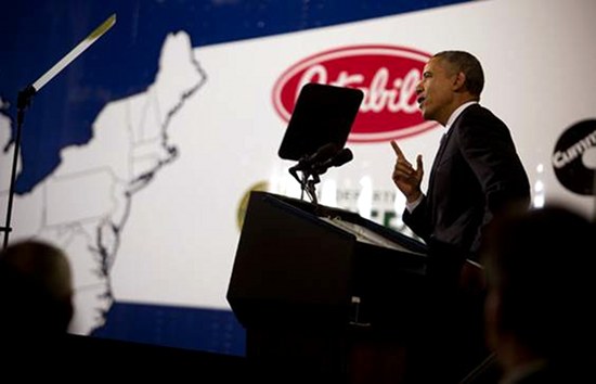 The SuperTruck serves as a prominent backdrop for a February speech by President Barack Obama on greenhouse gas emissions and fuel efficiency standards. (Photo courtesy ORNL)