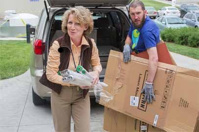 ORAU employee Gina Wampler carries florescent light bulbs to be recycled as Anthony Crider breaks down a cardboard box for recycling during ORAU’s annual Earth Day event.