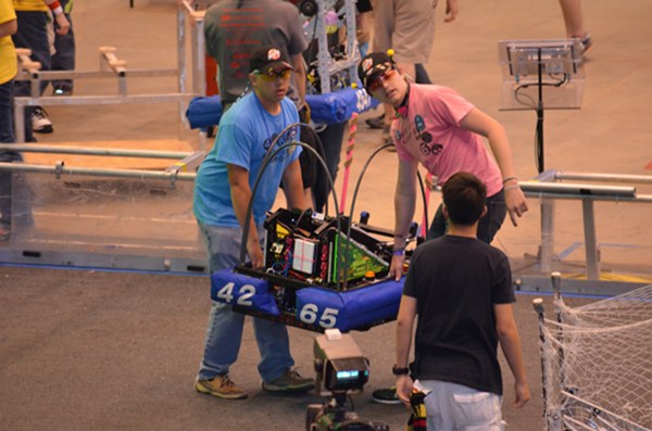 Andreas Franco (left) and Luke Buckner load the robot onto the field in preparation for Friday’s last qualifying match.