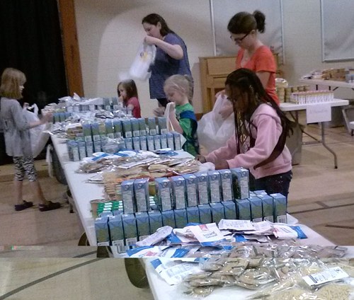 Girl Scouts packing food bags for distribution to school children who need food on the week end. From left to right in back are Brownie GS Becca Seay with Talia Seay and leader Christina Seay; Daisy GS, Riley Cureton with leader, Julie Cureton; and Brownie GS Simeko Carter (front).