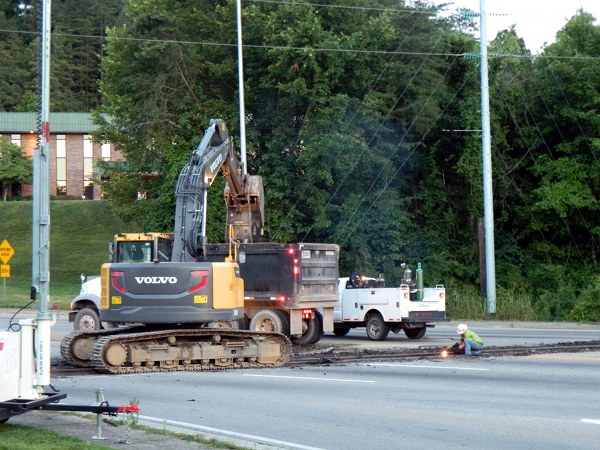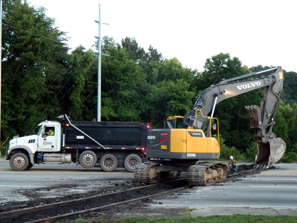 The crews used dump trucks, an excavator, and a cutting torch, among other equipment, to remove the tracks.