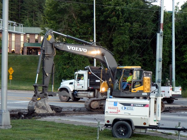 A work crew from Rogers Group removes unused railroad tracks from South Illinois Avenue just south of Lafayette Drive and Scarboro Road on Saturday night. After the tracks were removed, the railroad crossing was repaved, and the road reopened on Sunday.