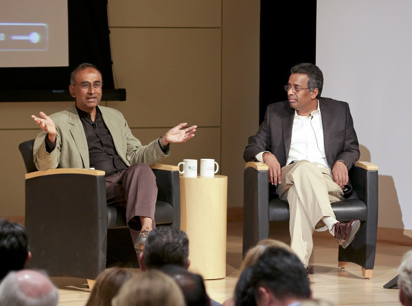 Venkatraman Ramakrishnan (left) takes questions from the audience following his lecture, facilitated by ORNL deputy director for science and technology Ramamoorthy Ramesh.