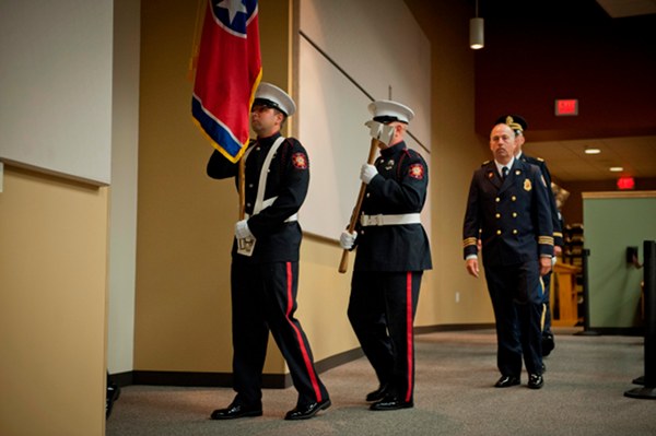 The ceremony at Oak Ridge High School included students and staff, and the Oak Ridge police and fire departments.