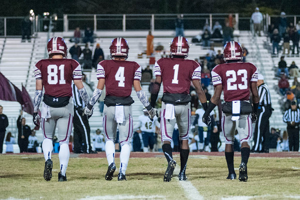 The senior members of the Oak Ridge secondary are pictured above. From left to right they are safeties Brandon Bonds (81) and Tommy Kaczocha (4), and cornerbacks Ted Mitchell (1) and Jemiah Hall (23). Bonds returned an interception 87 yards for a touchdown, Kaczocha returned a goal-line interception 25 yards to set up an Oak Ridge scoring drive, and Mitchell had three blocked passes.