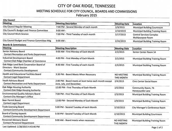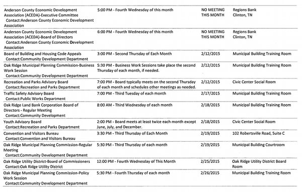 Here is the calendar of meetings of the Oak Ridge City Council and boards and commissions for February 2015:
