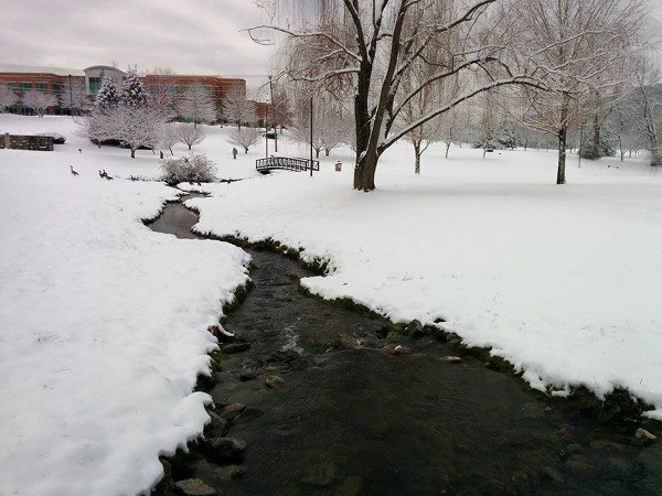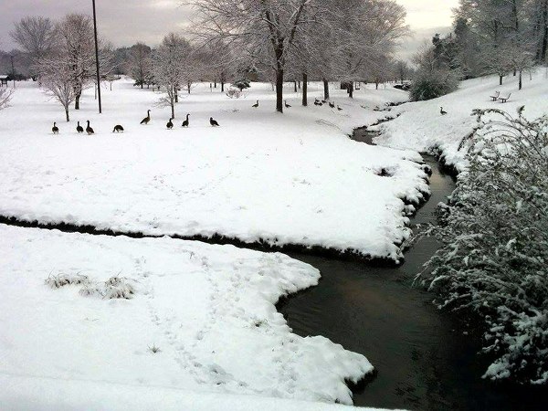 A creek flows through snow-covered Alvin K. Bissell Park in Oak Ridge on Thursday. (Photo by Anna Freeman)