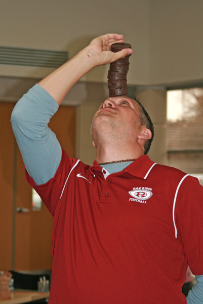 In It to Win It Game Master and Assistant Superintendant of Oak Ridge Schools Chris Marczak shakes things up as he attempts to empty the mint containers without using his hands. (Photo by MMC)