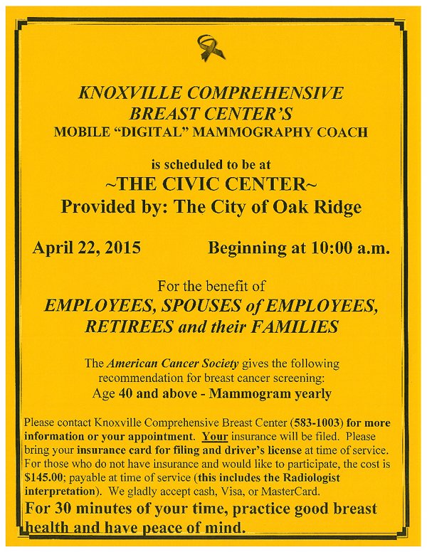 The Knoxville Comprehensive Breast Center will have a mobile mammography coach starting at 10 a.m. for employees, spouses of employees, retirees, and their families. Appointments are required and can be made by calling (865) 583-1003.