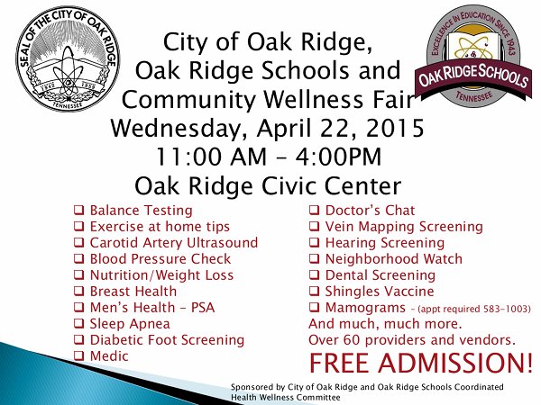 The City of Oak Ridge and Oak Ridge Schools will have a Community Wellness Fair on Wednesday, April 22.