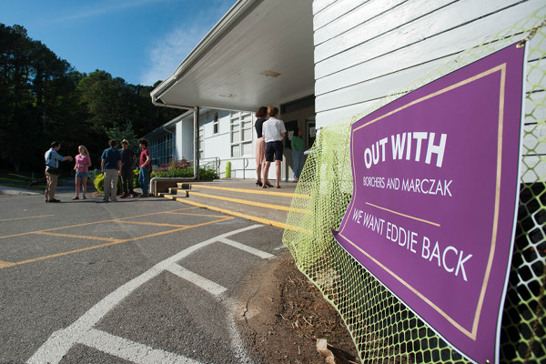 On Wednesday, Don Carlson, who brought a sign that said “Out with Borchers and Marczak—We Want Eddie Back,” called the concerns over the track meet “a tempest in a teapot.”