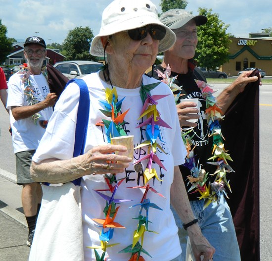 Boertje-Obed, Rice, and Walli joined about 125 other anti-nuclear weapons activists who rallied at the Oak Ridge Civic Center on Saturday and marched, drumming and chanting, almost two miles to Y-12. There, activists who object to the nuclear weapons work conducted at Y-12 tied peace cranes to a fence in front of the New Hope Center.